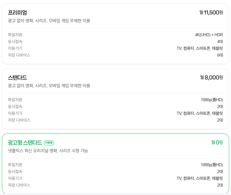 광고가 없는 일반 스탠다드와 4K로 영상을 시청하는 넷플릭스 프리미엄도 추가 요금을 지불 업그레이드 가능합니다